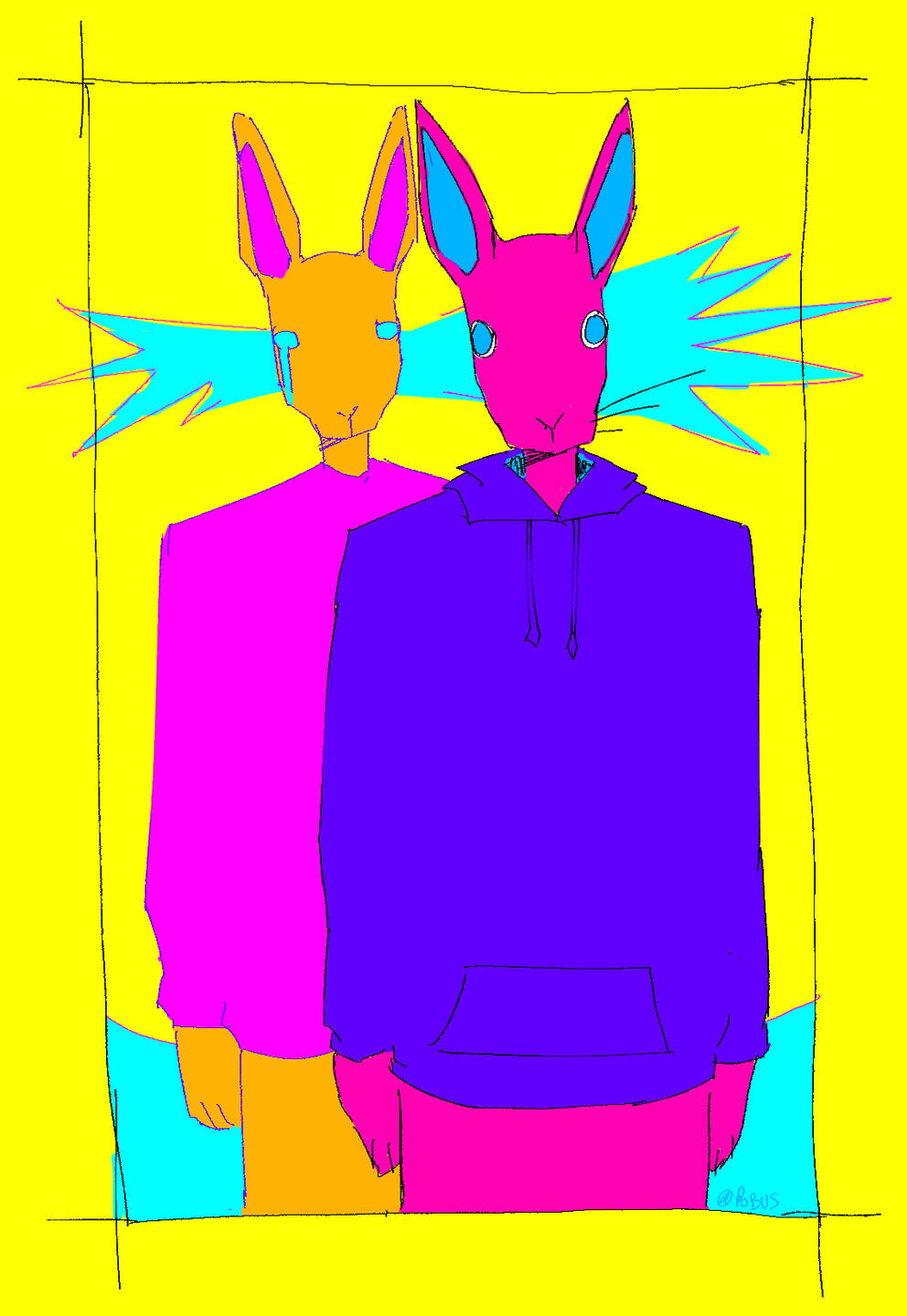 STYLIZED HALFBODY (EYESTRAIN) - $20Marked price for singular character. A doodle-style piece featuring a limited palette* of eyestrain colours. Unshaded by default. Limited examples, may be experimental!Simple background elements (see 1st image) come by no extra charge. Clarify at order+$5 add basic shading -- no direct halfbody examples yet. See STYLIZED BUST for the gist.+10$ add extra character
